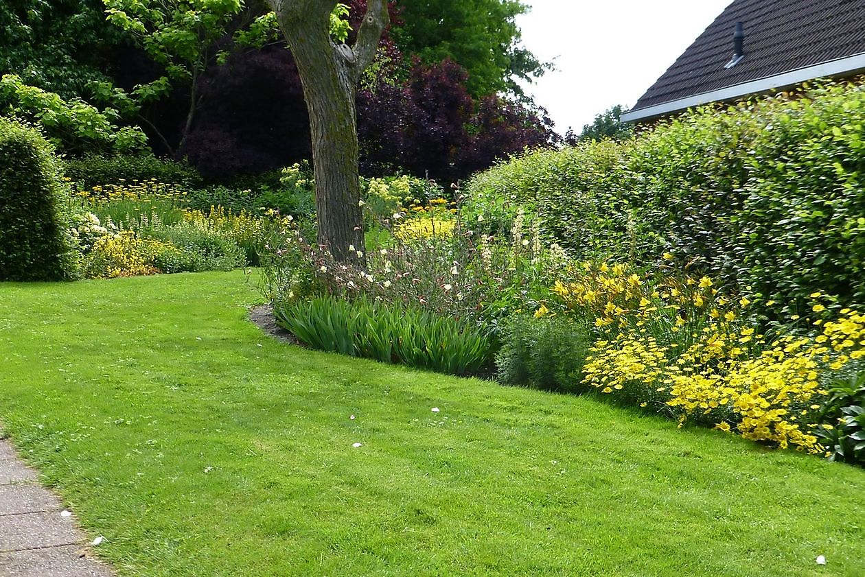 Der 4.000 m² große Garten ist von Weideland und einem Wäldchen umgeben. Im hinteren Bereich befinden sich dichte Hecken, eine Rasenfläche und Staudenbeete.