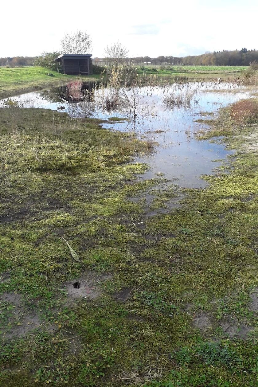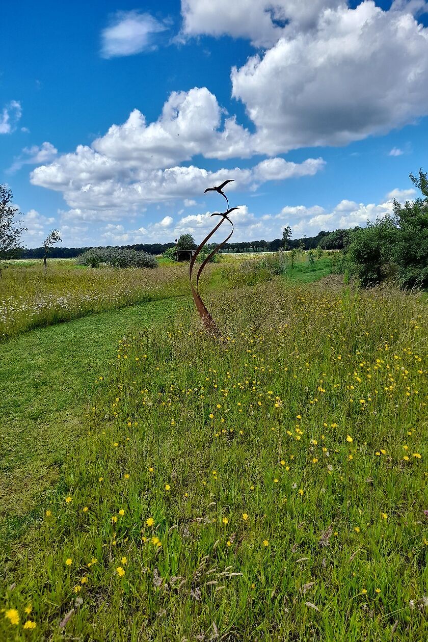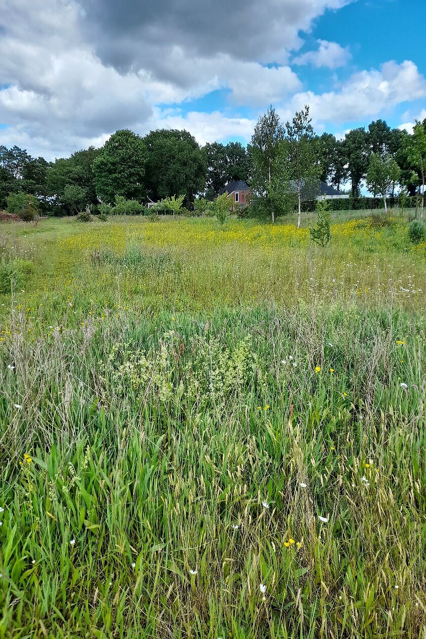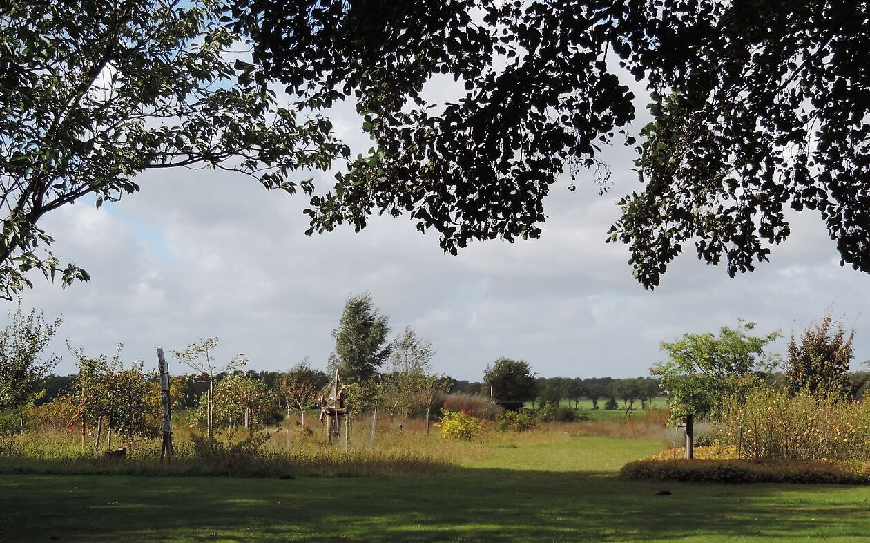 Een oude meidoornhaag. Grote oude elzen, eiken, esdoorns kastanjes en berken. Maar ook grote velden met wilde planten. Een siertuin met vijver. En een bospaadje.