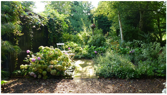 Der Garten ist liebevoll mit verschiedenen Materialien aus der Natur und selbstgetöpferten Gegenständen dekoriert.