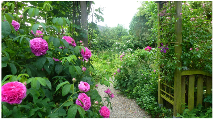 Mehrere Kieswege, an denen sich verschiedene Wasserspiele befinden, verbinden die unterschiedlichen Gartenräume. Sie führen vorbei am Bachlauf mit kleinem Teich, einer Vielzahl von Stauden, Rosen, Rhododendren, Gräsern, Farnen, Hostas, Ziergehölzen, Clematis und anderen Kletterpflanzen.