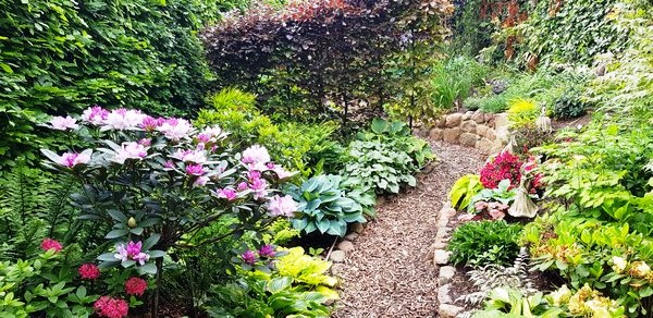 Der knapp 2000m² große Garten ist umrahmt von Taxus und Buchenhecken. In den Staudenbeeten finden sich die unterschiedlichsten Hosta- und Tagliliensorten. Außerdem eine große Vielfalt an Gräsern und Bauerngartenstauden, die in den buchsgesäumten Beeten besonders gut zur Wirkung kommen.